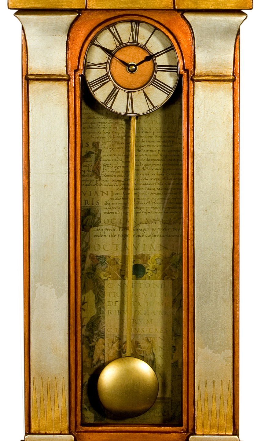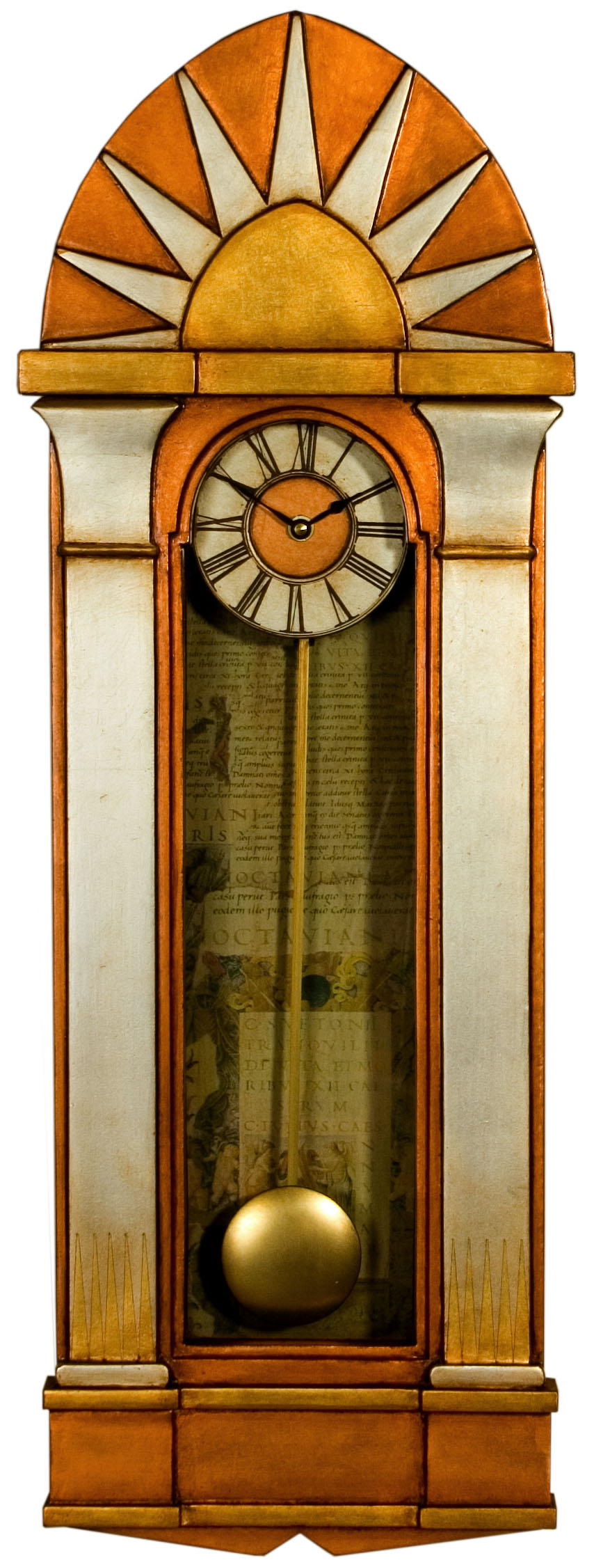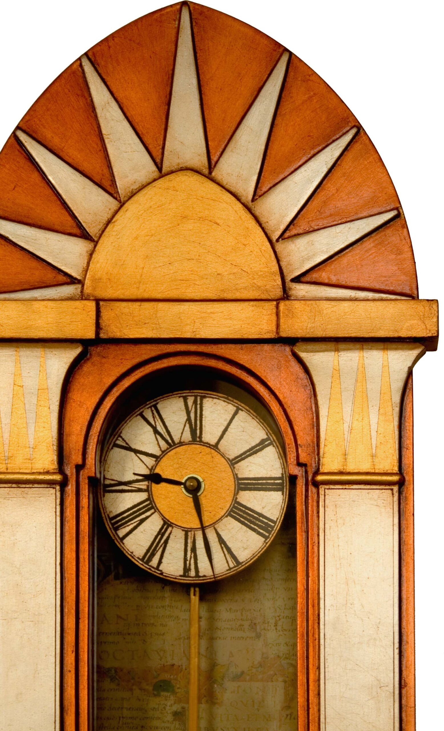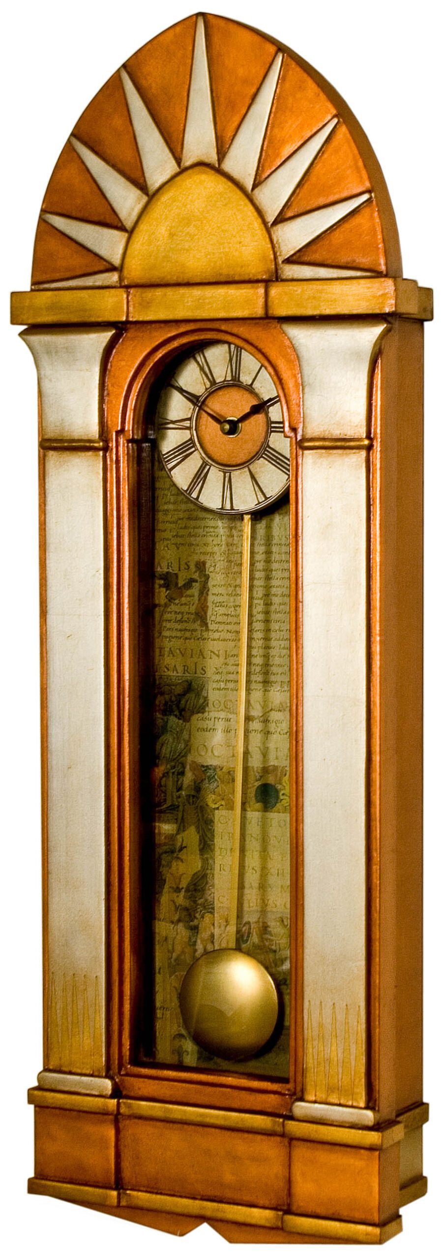 This hand made pendulum wall case clock is an ‘homage’ to the Deco lines of the Chrysler Building. This beautiful case clock’s Art Deco styling is subtly enhanced through the case clocks mixed gilded leaf finish and the 1930’s architectural collage prints used to line the clock’s casement to give it that final touch of Deco refinement and sophistication.