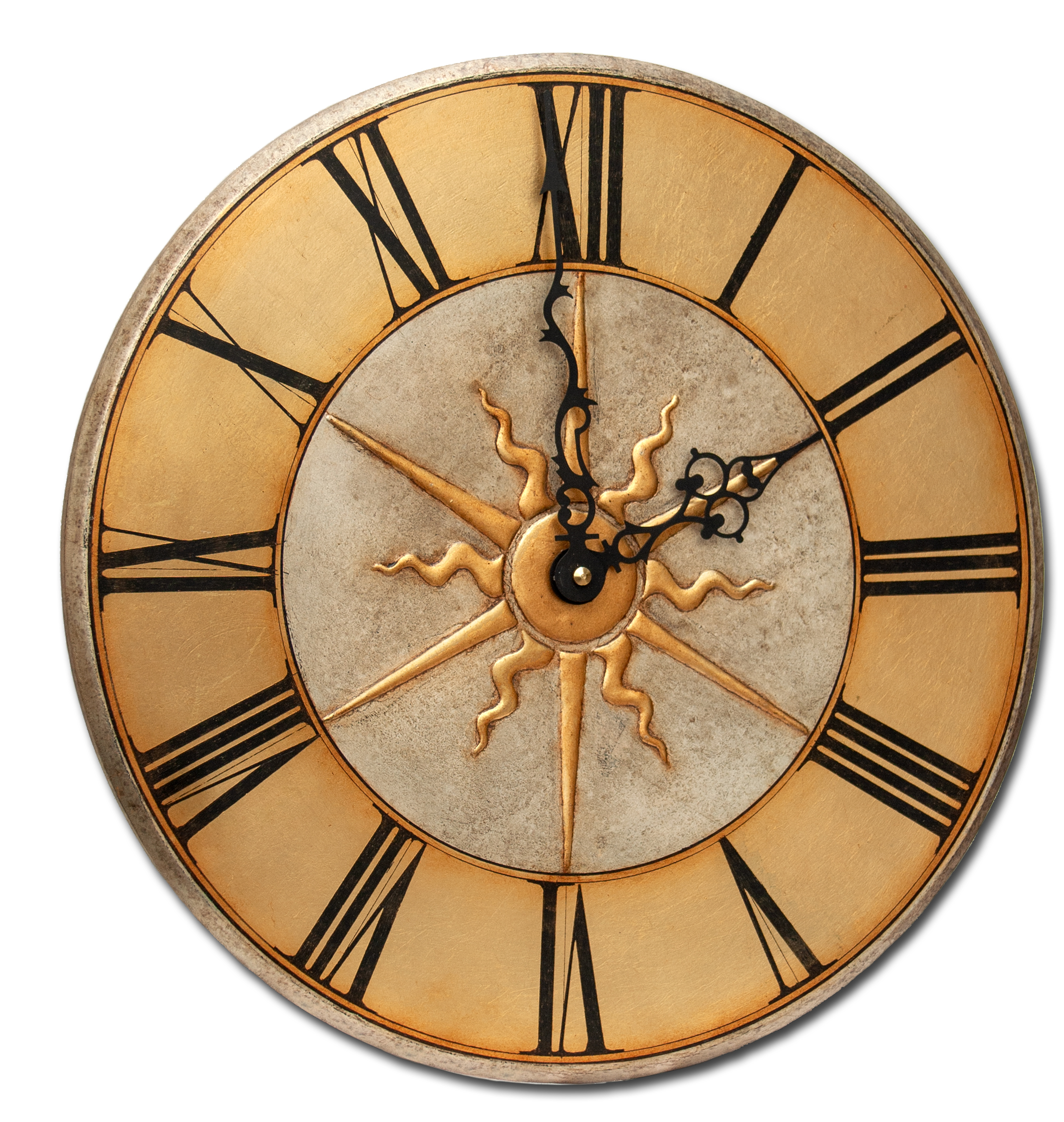 The clean uncluttered lines of my Medium Round Wall Clocks are decorated with sun details at their centres which are applied by hand using a traditional combo\\\’ technique and gilded in tarnished silver and gold. In keeping with the hand made clock feel their clock dials are hand etched with either four or twelve numbers depending on the size of round clock.