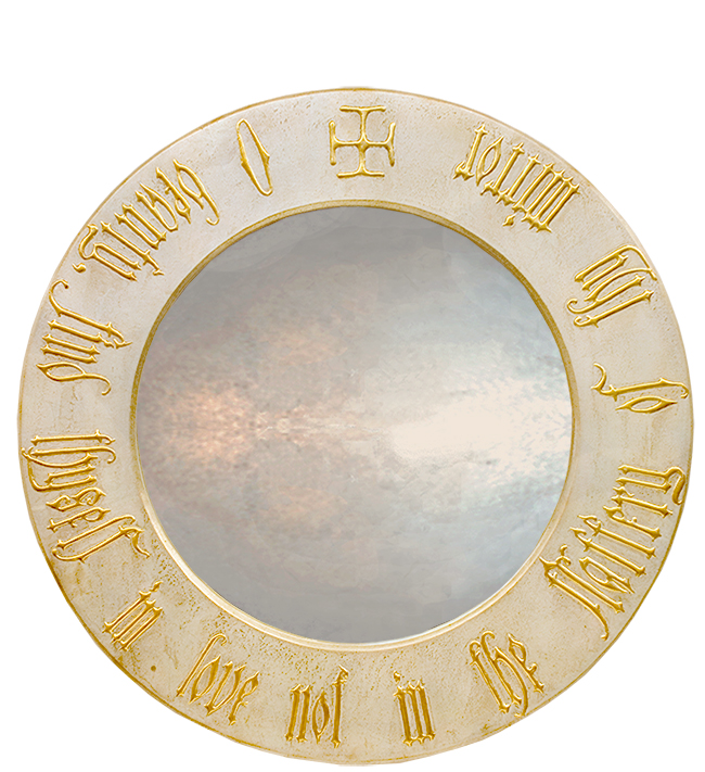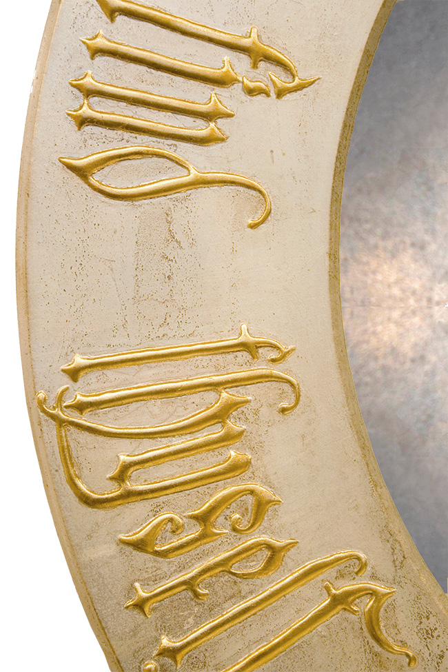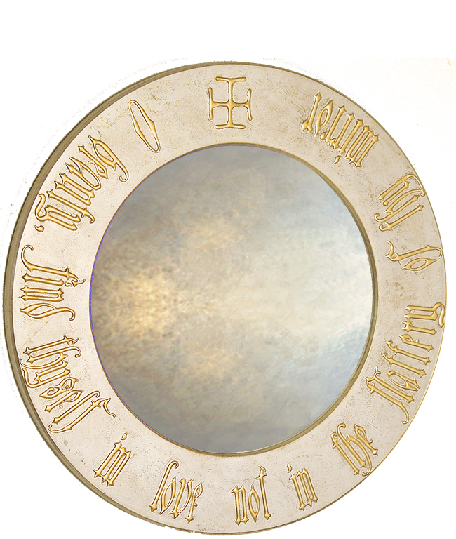 Once in a while you get it right and this beautiful Round Gothic Mirror, I would suggest, is one such instance. Its script boarder is created in relief using a traditional ‘combo’ technique and is picked out in gold leaf on a gilded tarnish silver leaf base.
