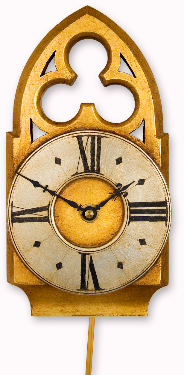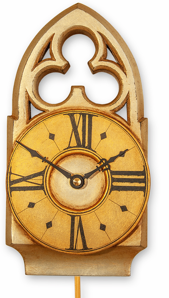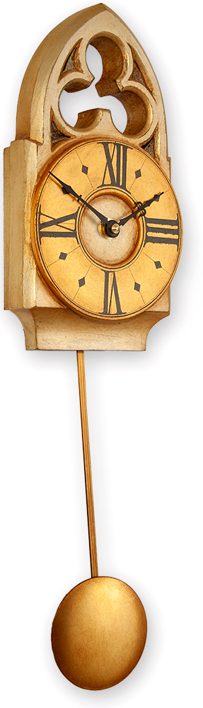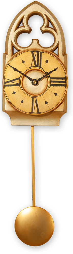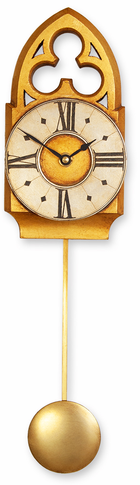 The distinctive character of this gothic pendulum clock comes from its compact, robust lines and it\\\’s gilded ornate freted crest. This is further enhanced by the antiqued gold and sliver finish. The pendulum length can be adjusted to suit one\\\’s requirements.